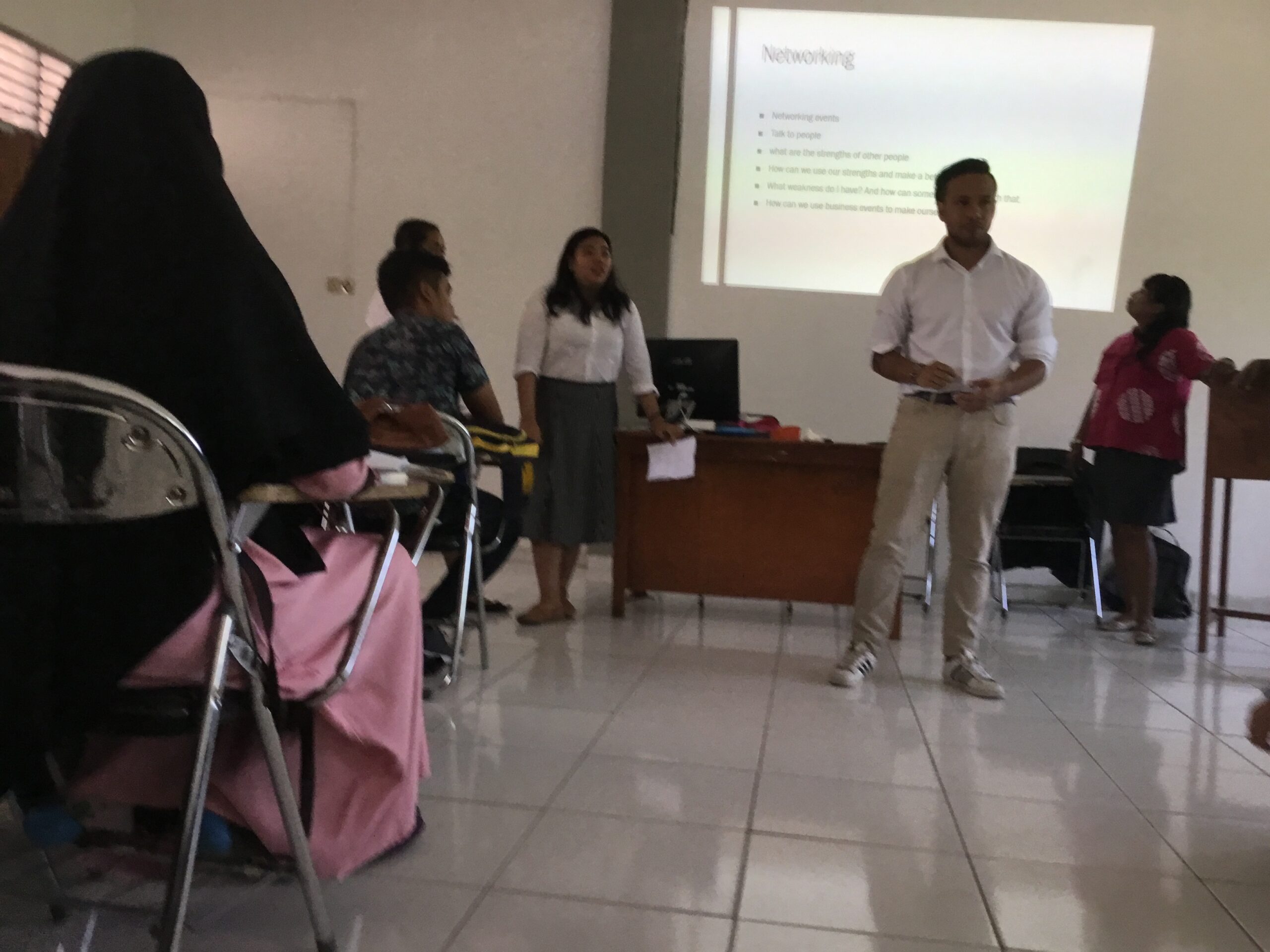 Ruim van tevoren werden de studenten op de hoogte gesteld wat besproken zou worden tijdens het gastcollege. De studenten kwamen in groten getale op de presentatie af. De presentatie werd in het Engelse taal gevoerd en door een medewerkster terugvertaald in het Indonesisch. Tijdens de presentatie werden vragen gesteld en hebben de studenten zich aan het nadenken gezet over hun eigen toekomst binnen de gepresenteerde thema’s. Ook de levendige discussie tussen gastdocent, studenten- en studenten onderling over bijv. toekomst perspectief werd als zeer nuttig en interessant ervaren. Na afloop van het gastcollege werden telefoonnummers en mailadressen uitgewisseld om zo contact met elkaar te blijven houden.